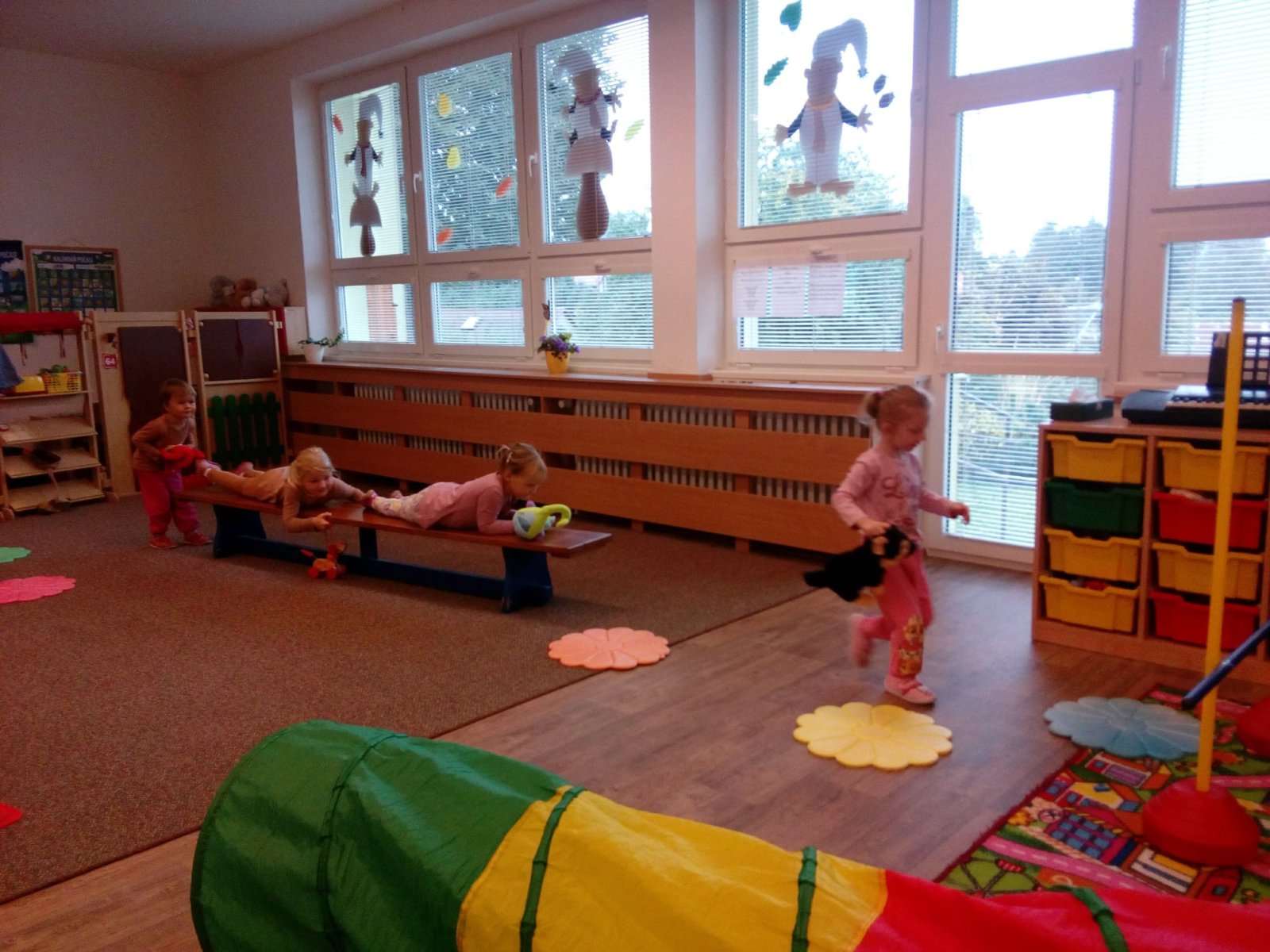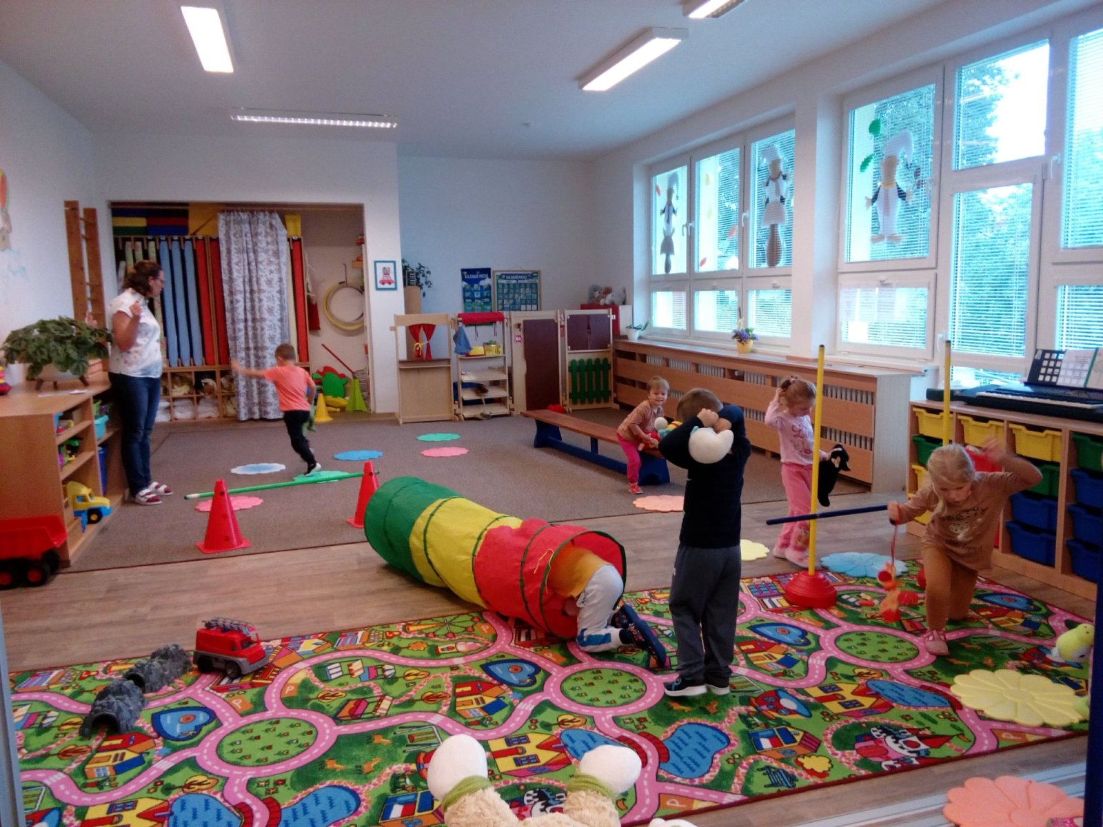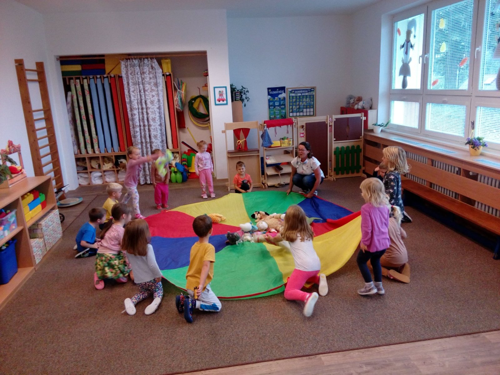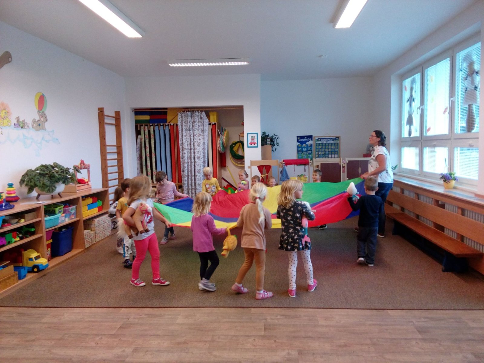 Hračky jsme si vzájemně představovali a půjčovali kamarádům, cvičili s nimi, prolézali s námi překážkovou dráhu, pohoupali se a zařádili jsme si s padákem. Věříme, že si to všichni náramně užili.