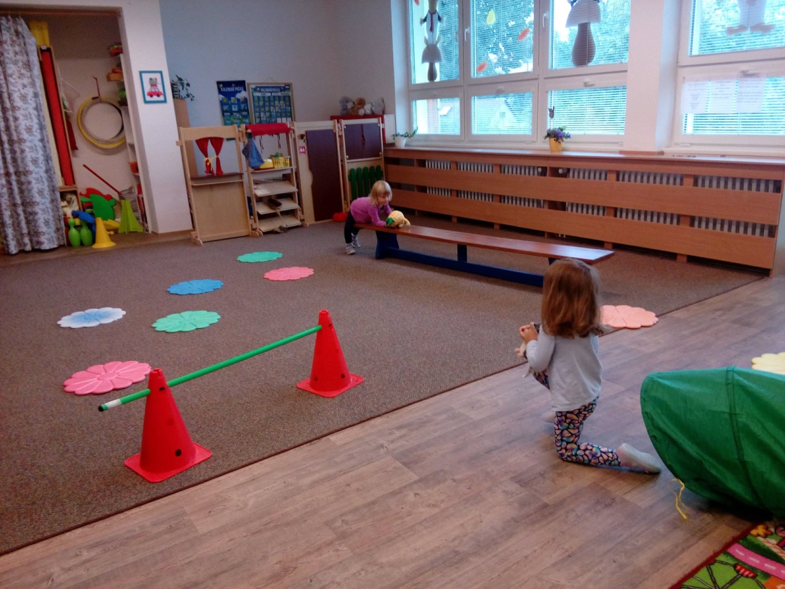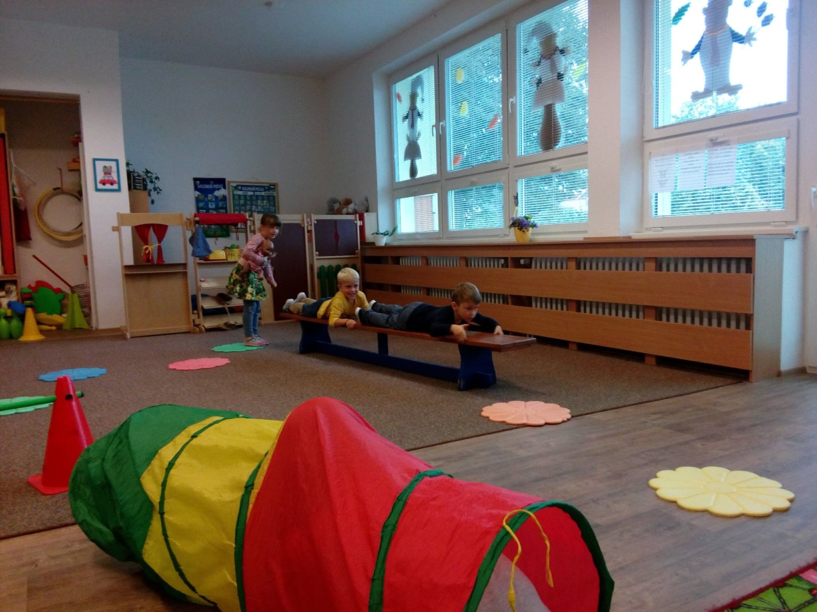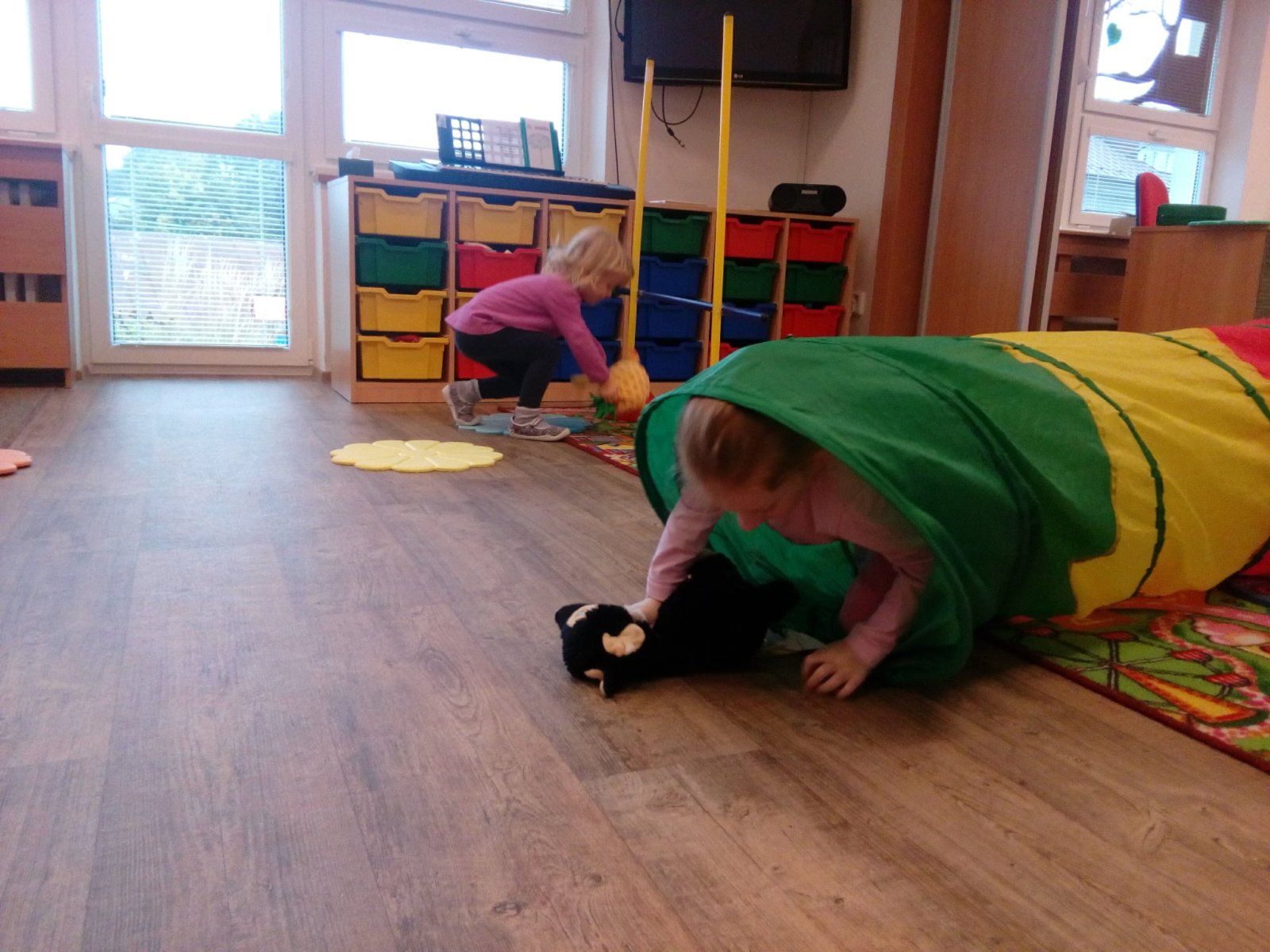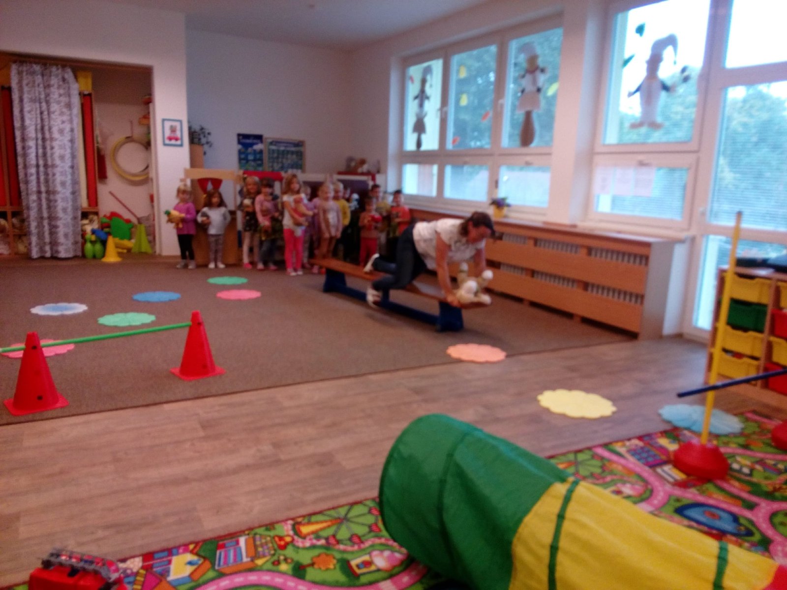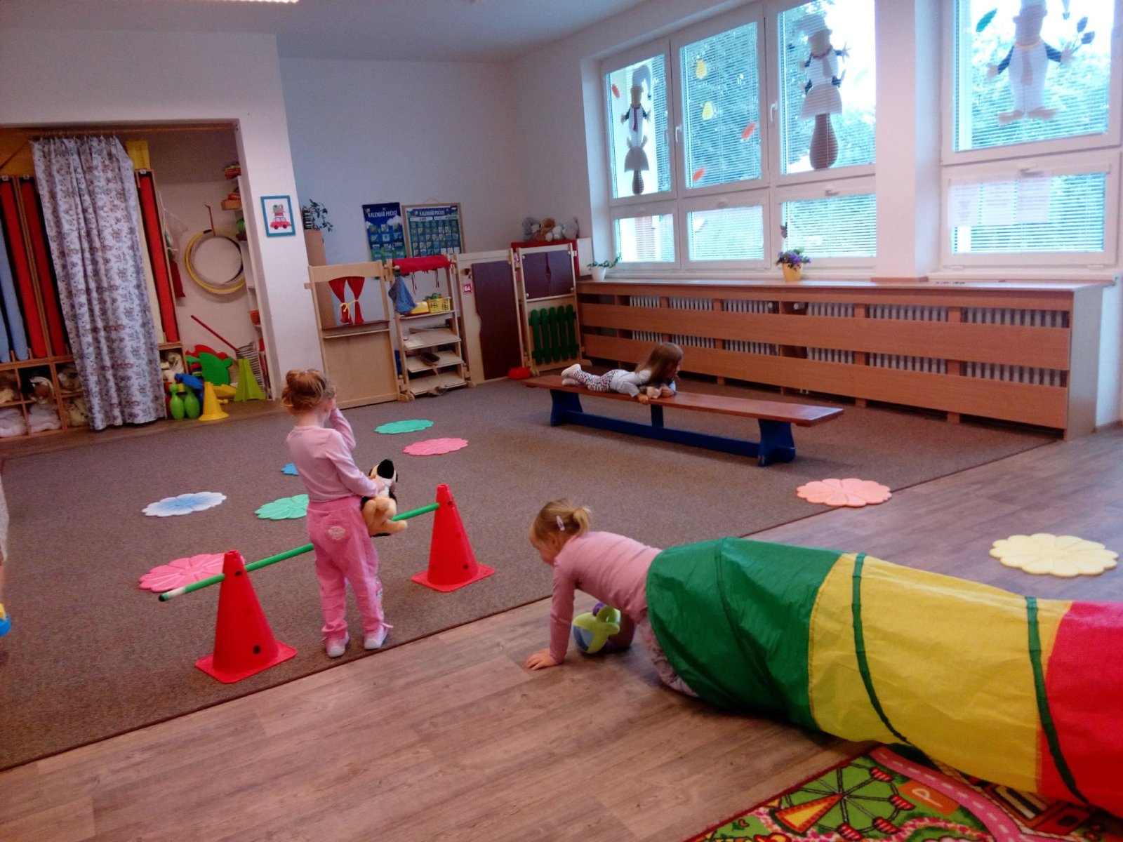 Hračky jsme si vzájemně představovali a půjčovali kamarádům, cvičili s nimi, prolézali s námi překážkovou dráhu, pohoupali se a zařádili jsme si s padákem. Věříme, že si to všichni náramně užili.