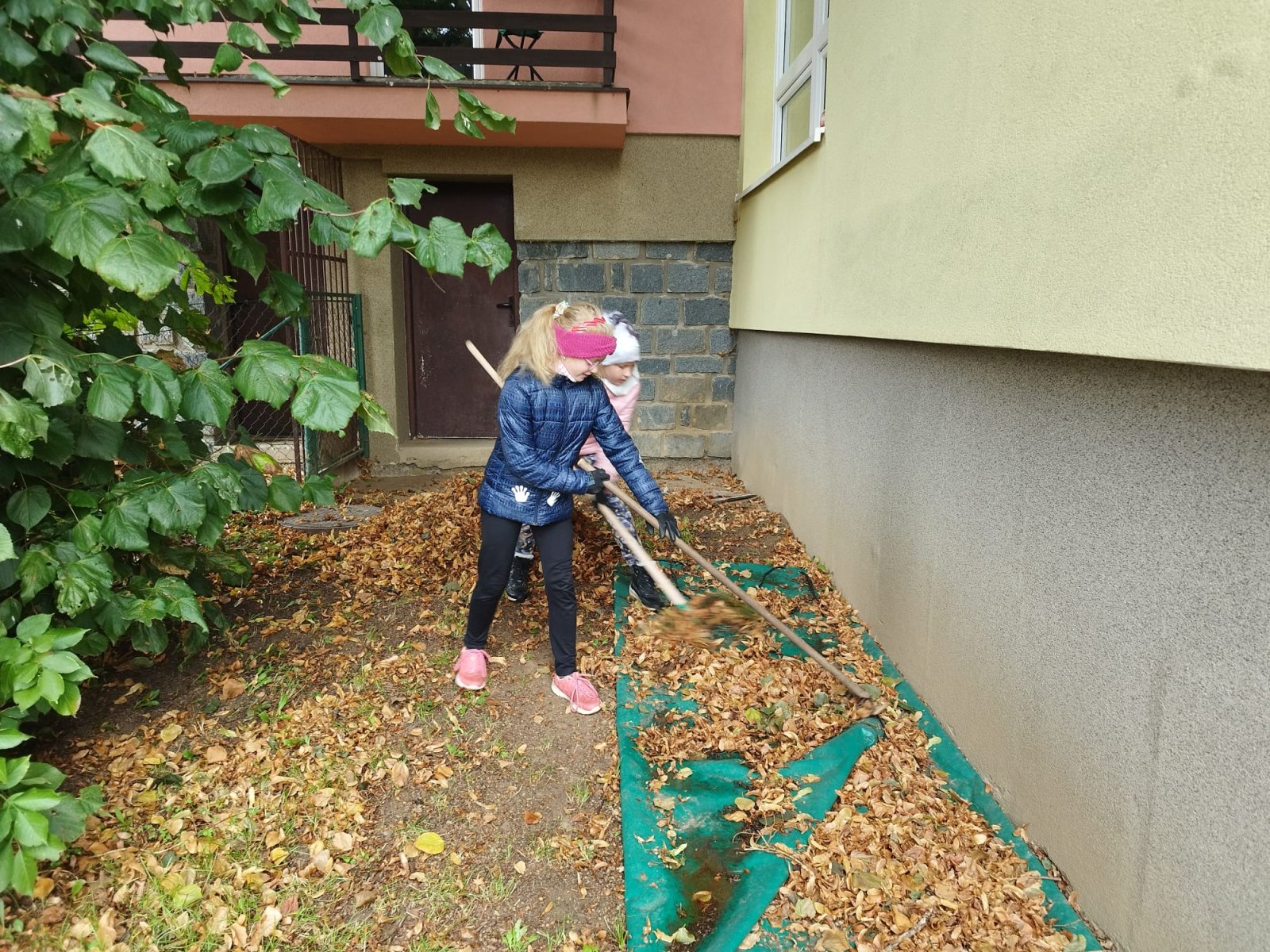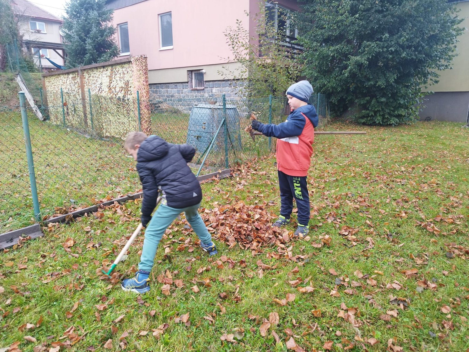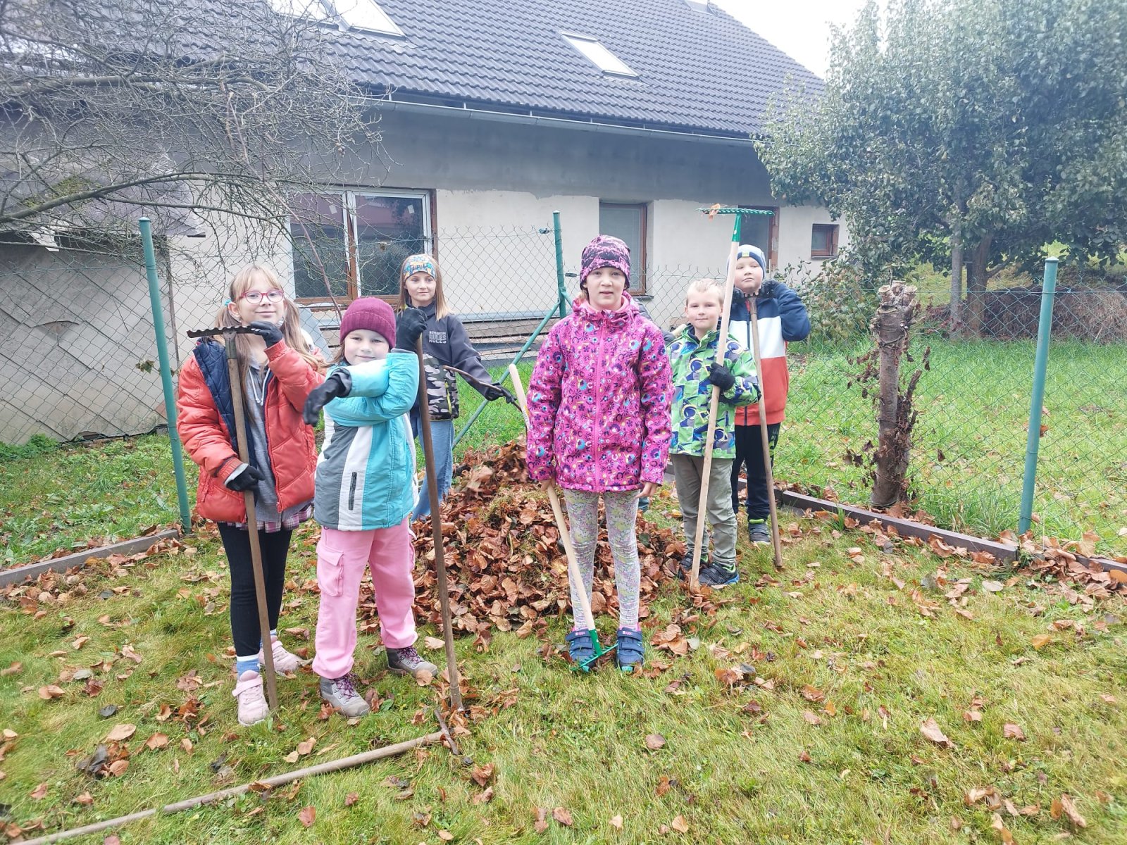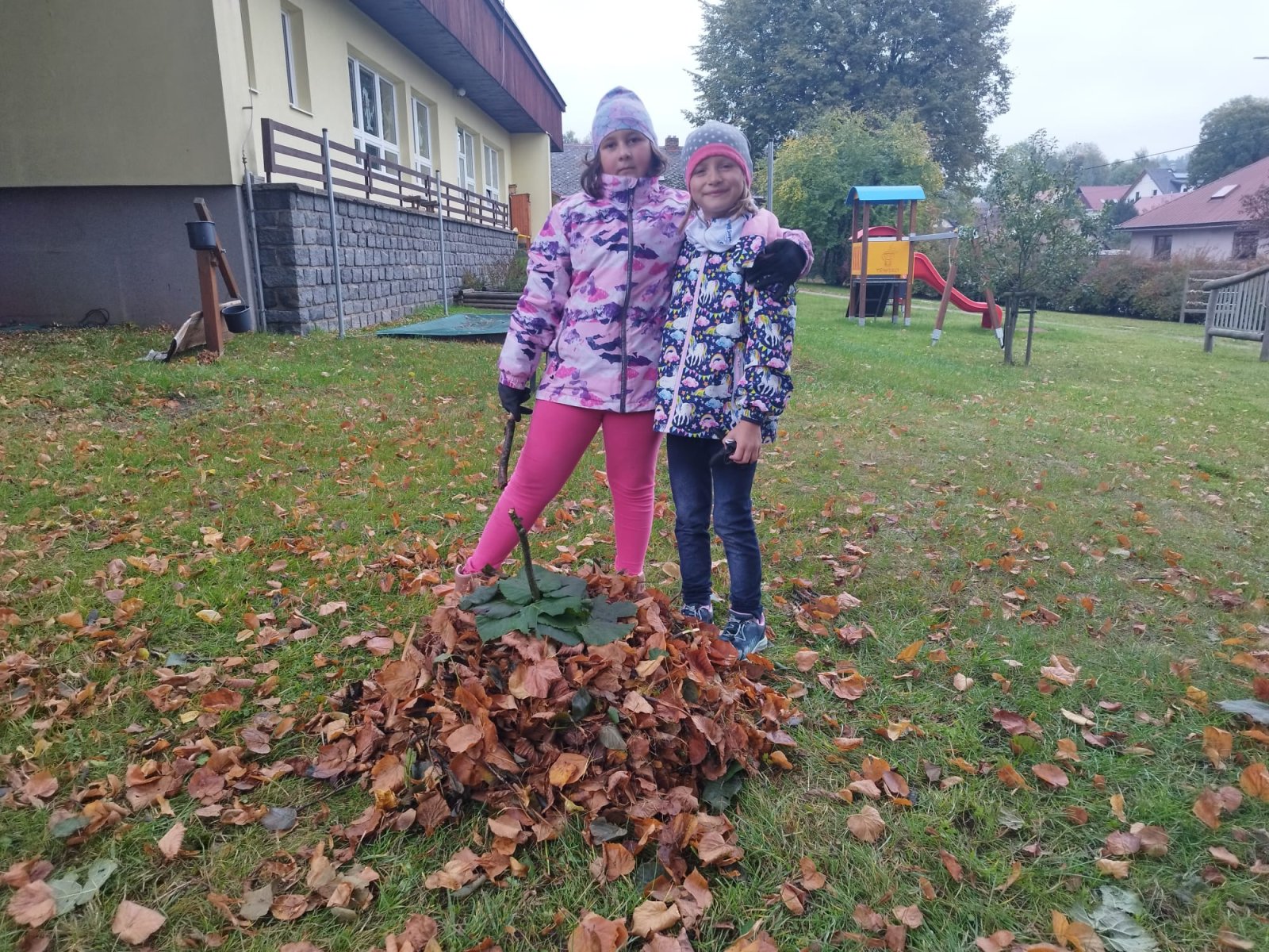 Ve škole jsme s dětmi využili pěkného počasí a v rámci výuky praktických činností se pustili do hrabání listí na zahradě. Nechybělo také společné tvoření z přírodnin technikou land art.