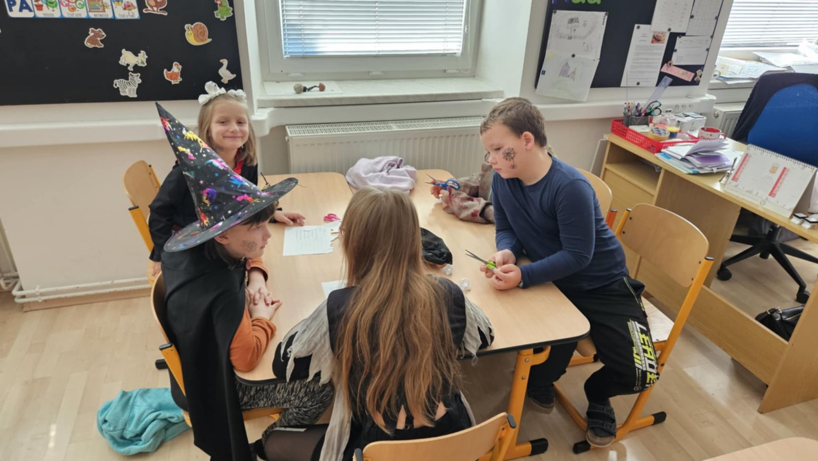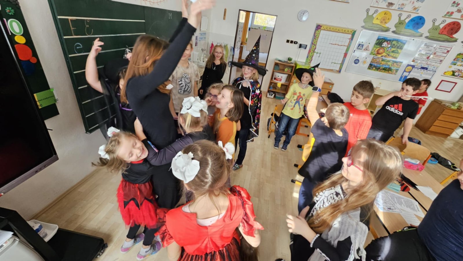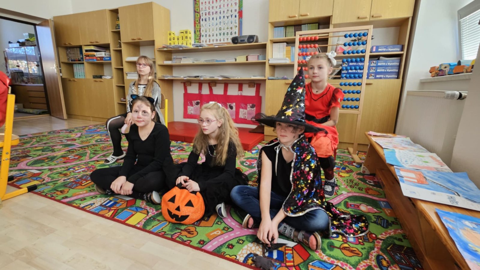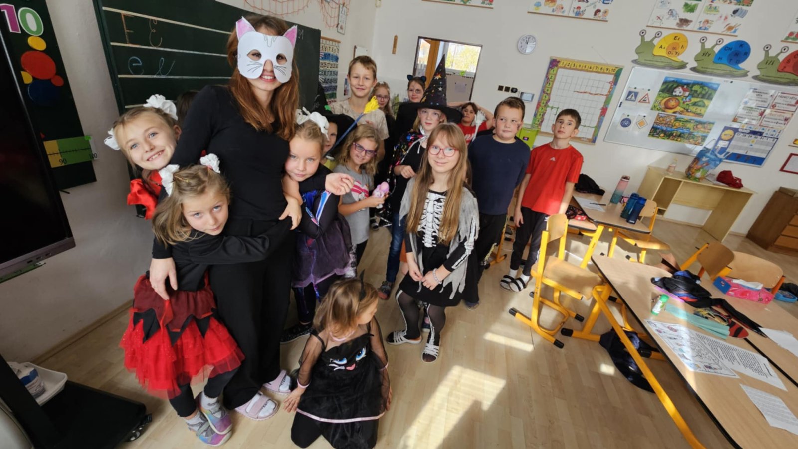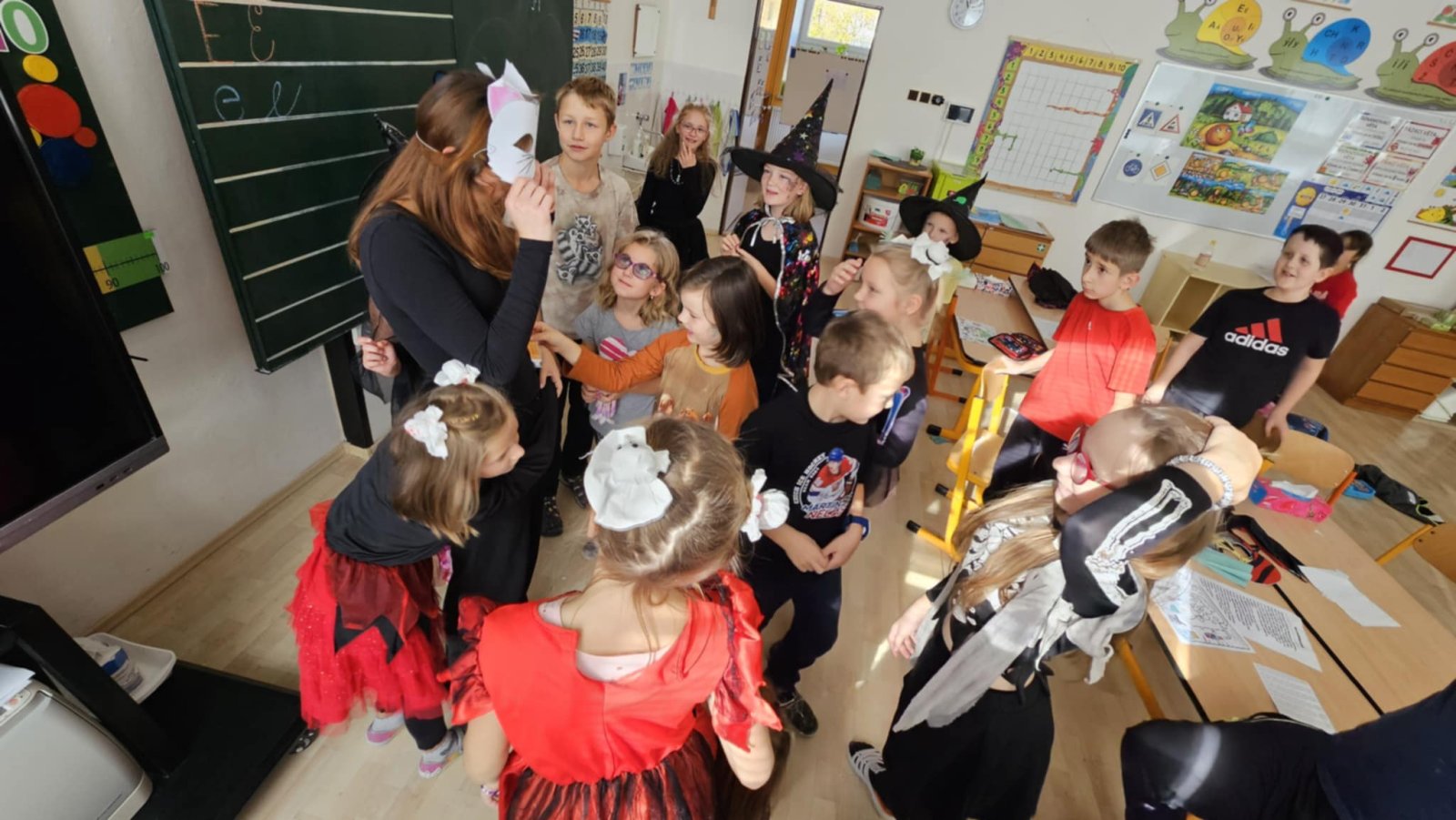 Žáci 1.–5. tříd si užili strašidelně zábavné dopoledne! Do školy přišli v nejrůznějších maskách, dozvěděli se o původu a tradicích Dušiček i Halloweenu a poté se pustili do kouzelné hry. Zlá čarodějnice Morgana začarovala paní učitelku do kočky, ale děti vše zvládly a paní učitelku nakonec úspěšně odčarovaly!