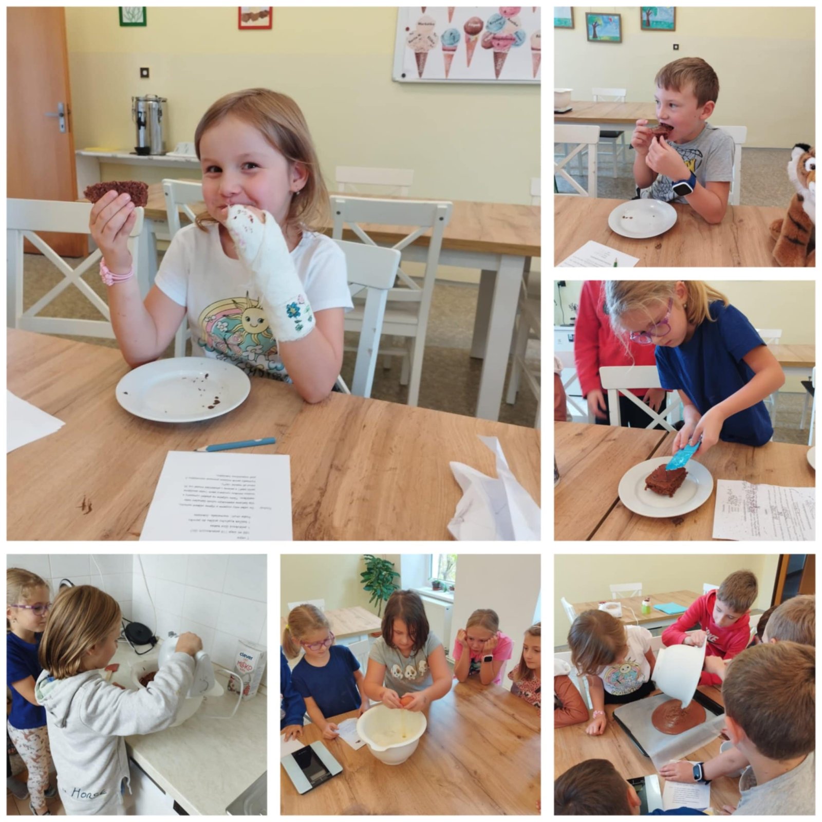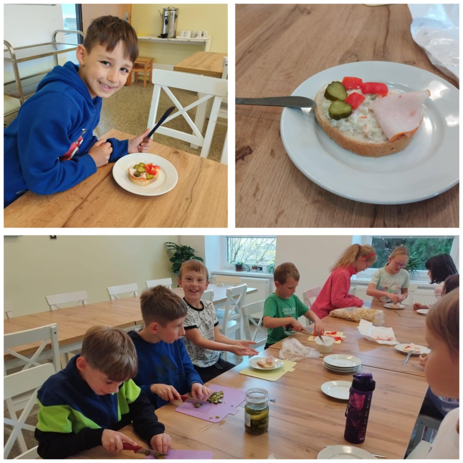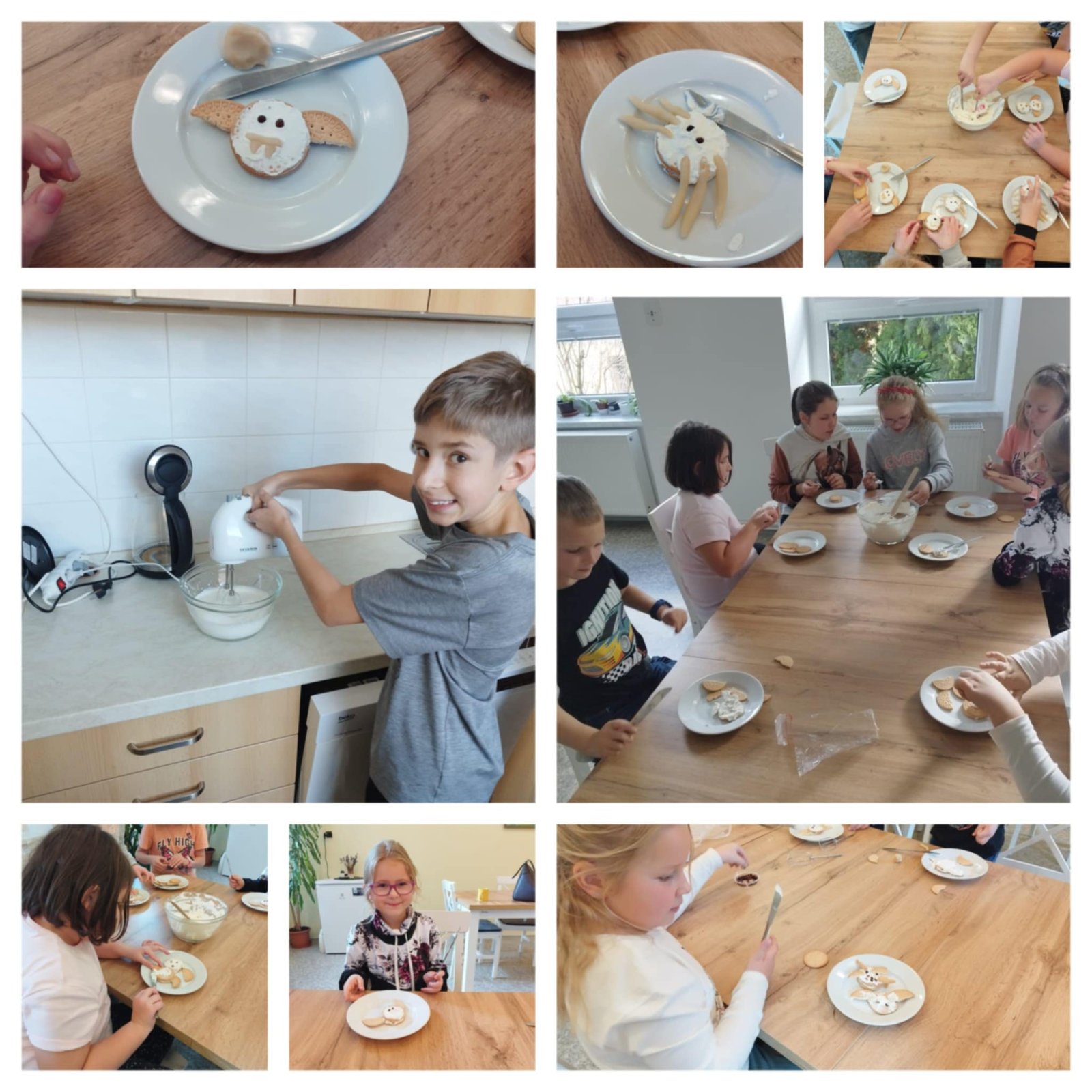Dalším receptem byl nadýchaný perník, který provoněl celou školu.Při jeho pečení si děti navíc zpestřily čas kvízem o vaření. Před podzimními prázdninami jsme si společně připravili chlebíčky, a konec října jsme oslavili halloweenským vařením. Děti si z sušenek a krému vytvořily netopýry, pavouky a další strašidelné pochoutky.