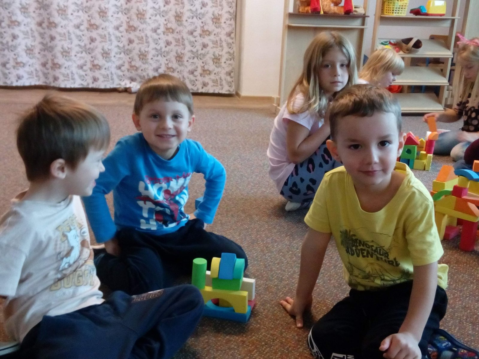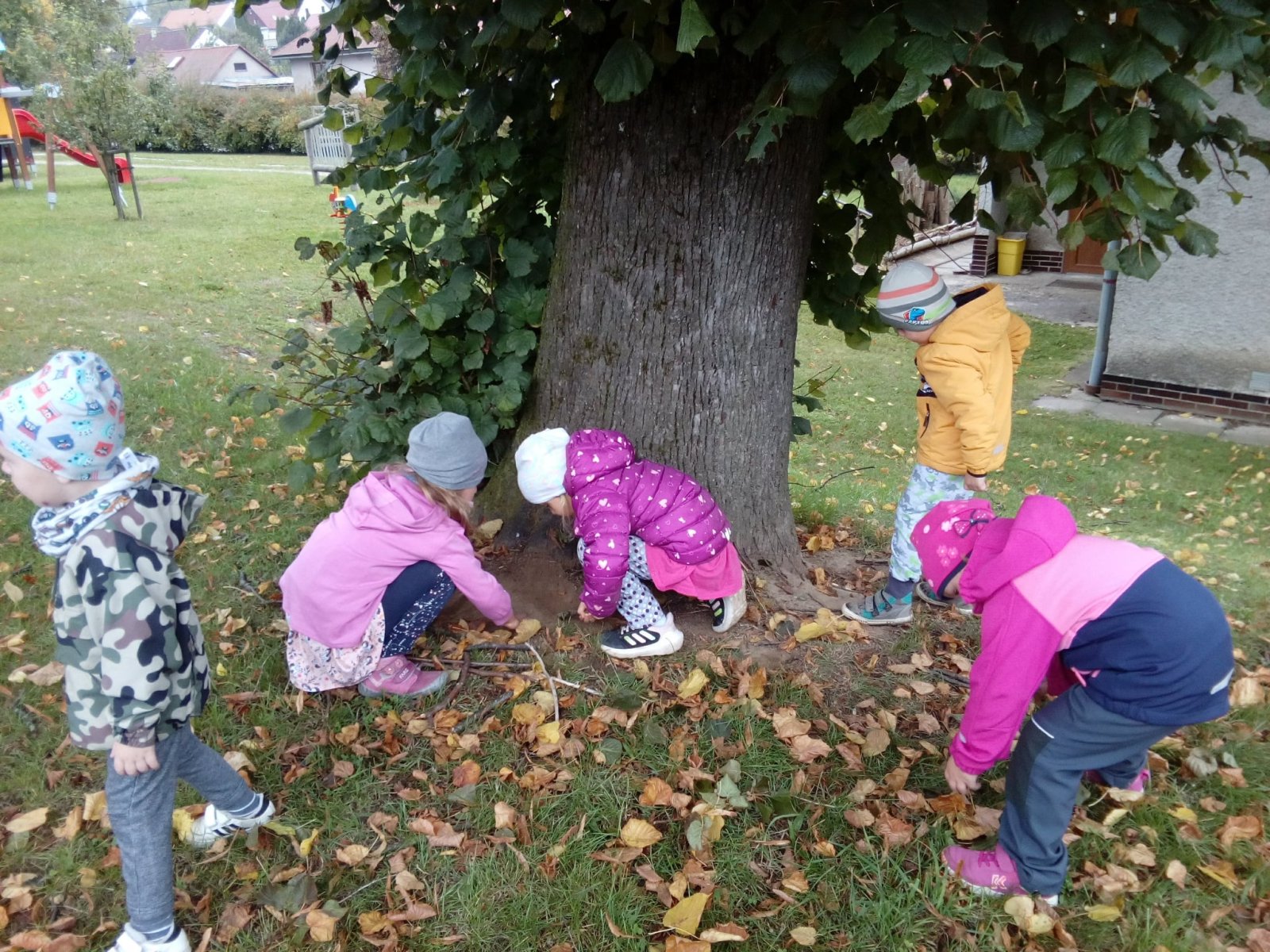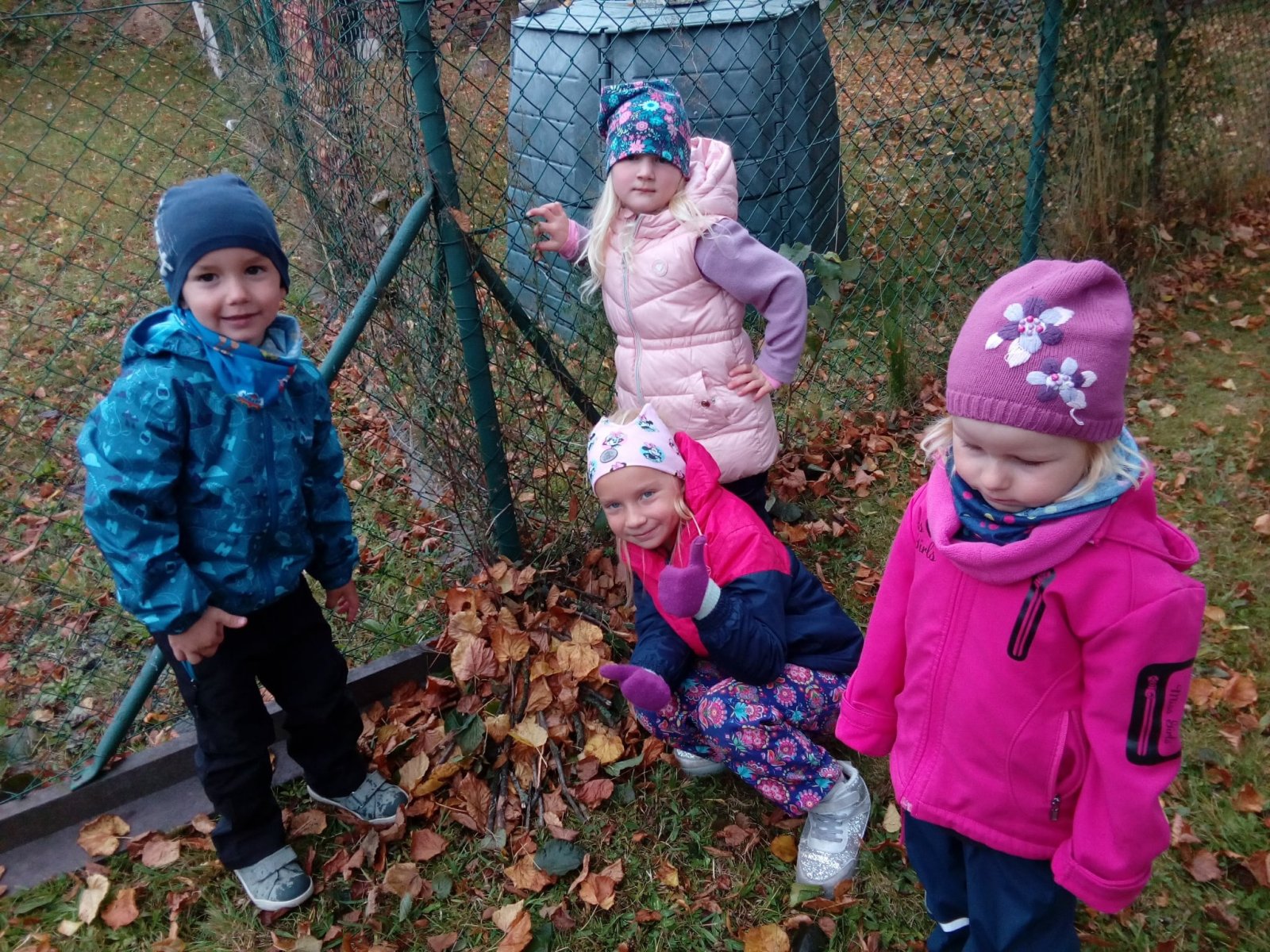 Také jsme si povídali o zvířátkách, jak se chystají na zimu, dělají si zásoby a připravují svá obydlí. Domečky pro zvířátka děti stavěly také venku na louce.