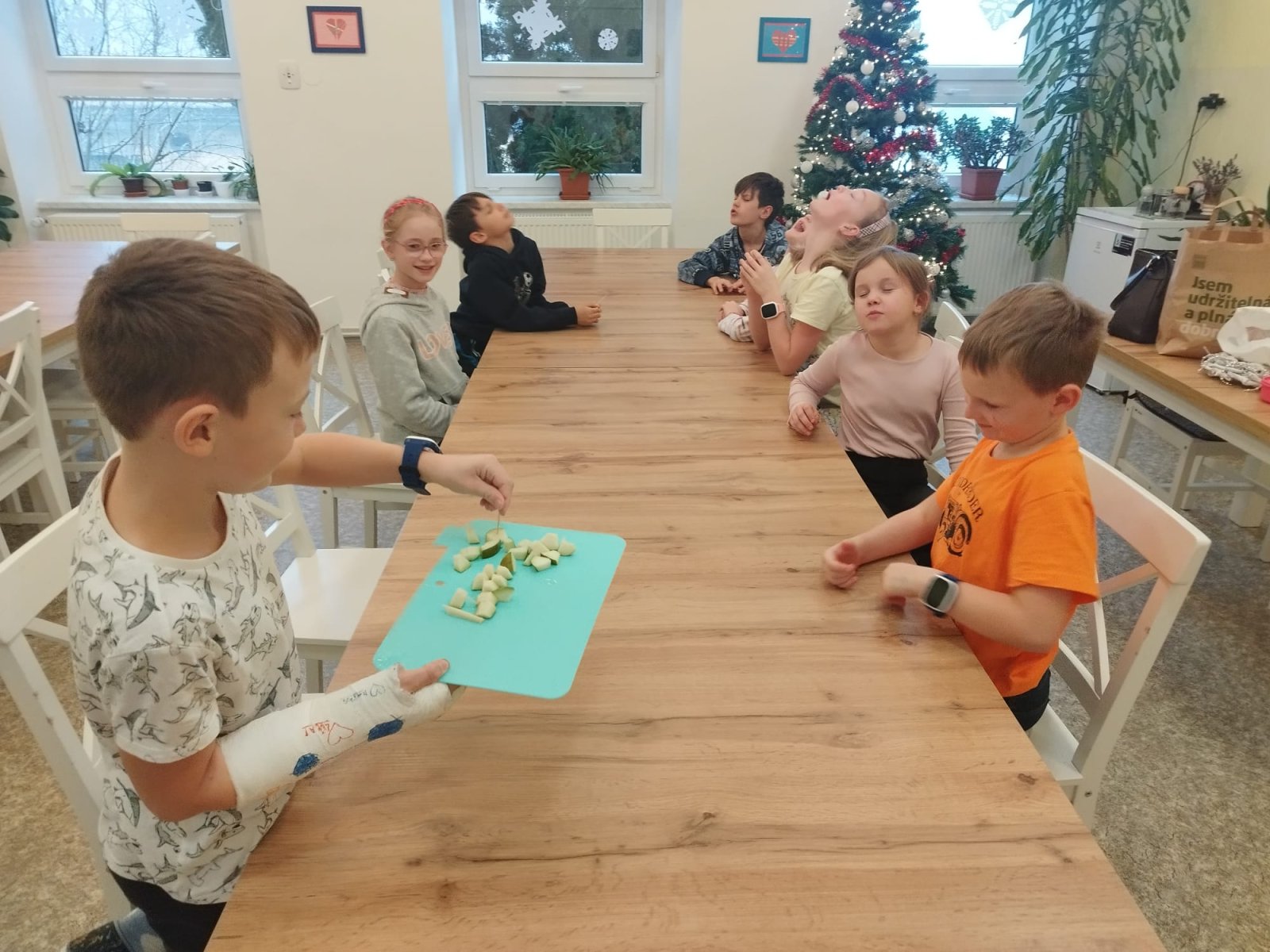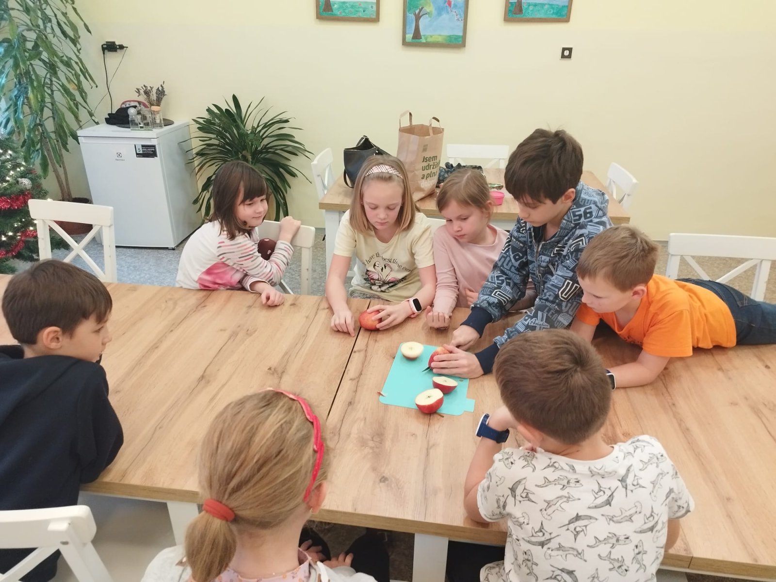 V prosinci jsme si v kroužku vaření užili zábavnou ochutnávku mikulášské nadílky poslepu, při které děti hádaly jednotlivé dobroty podle chuti a čichu. Dále jsme vyzkoušeli jednu z vánočních tradic - rozkrojení jablka.