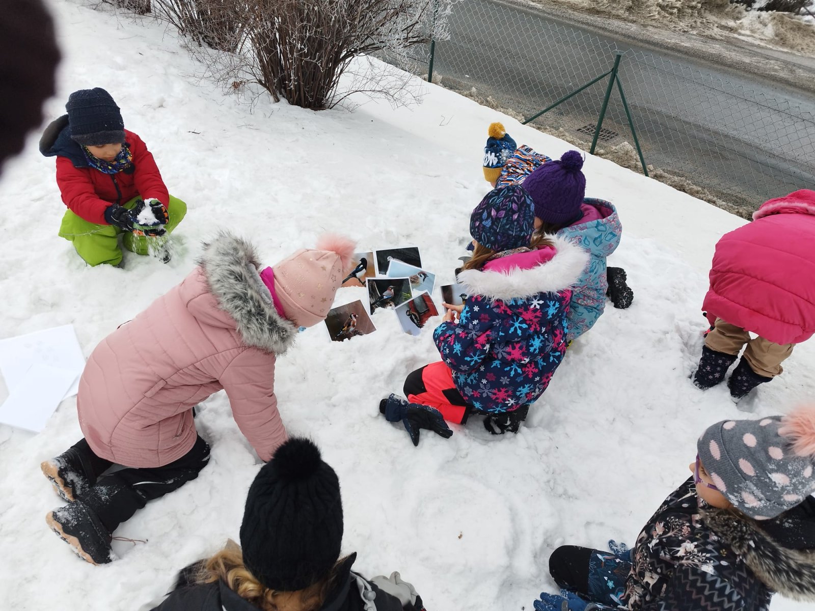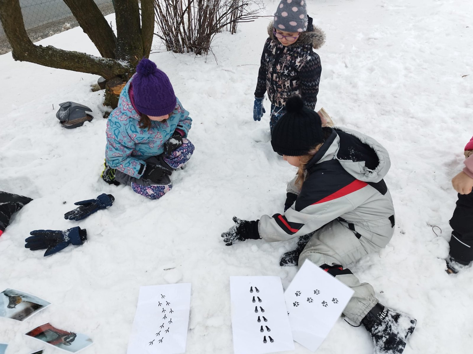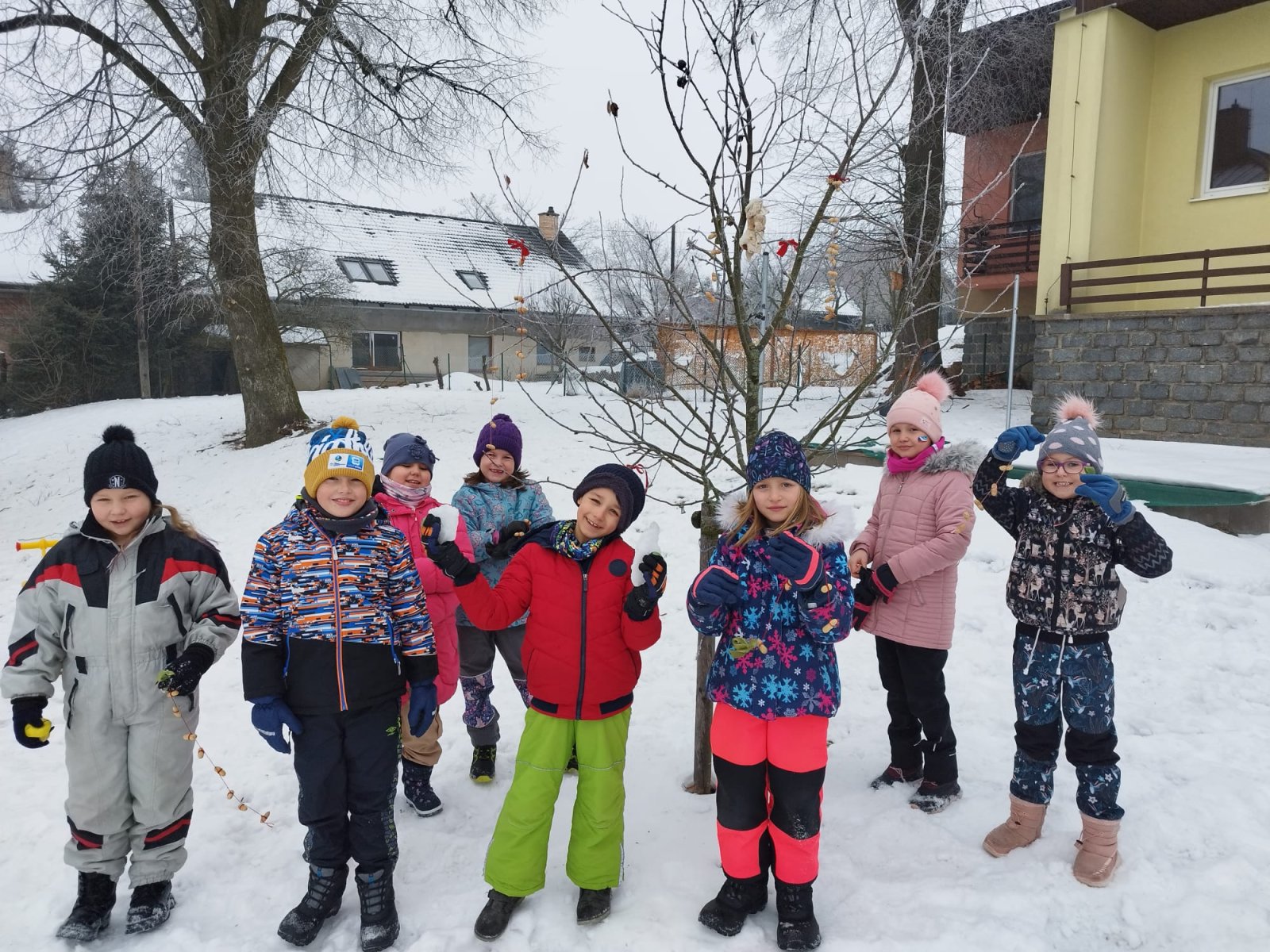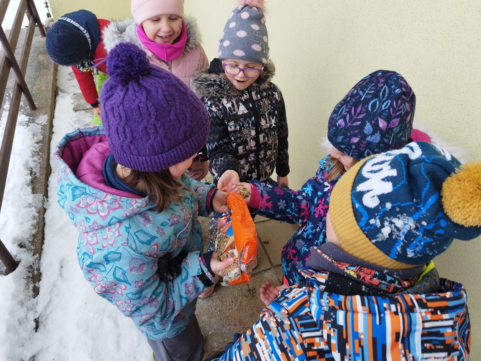 Děti 1. a 2. ročníku v pracovních činnostech připravily chutnou potravu pro ptáčky a společně jsme ji na naší zasněžené školní zahradě zavěsili. Doplnili jsme také naše krmítka pro ptáčky semínky a jablíčkem. Zopakovali jsme si, které ptáčky můžeme v zimě u krmítka spatřit a vyzkoušeli jsme si malování stop zvířátek do sněhu.