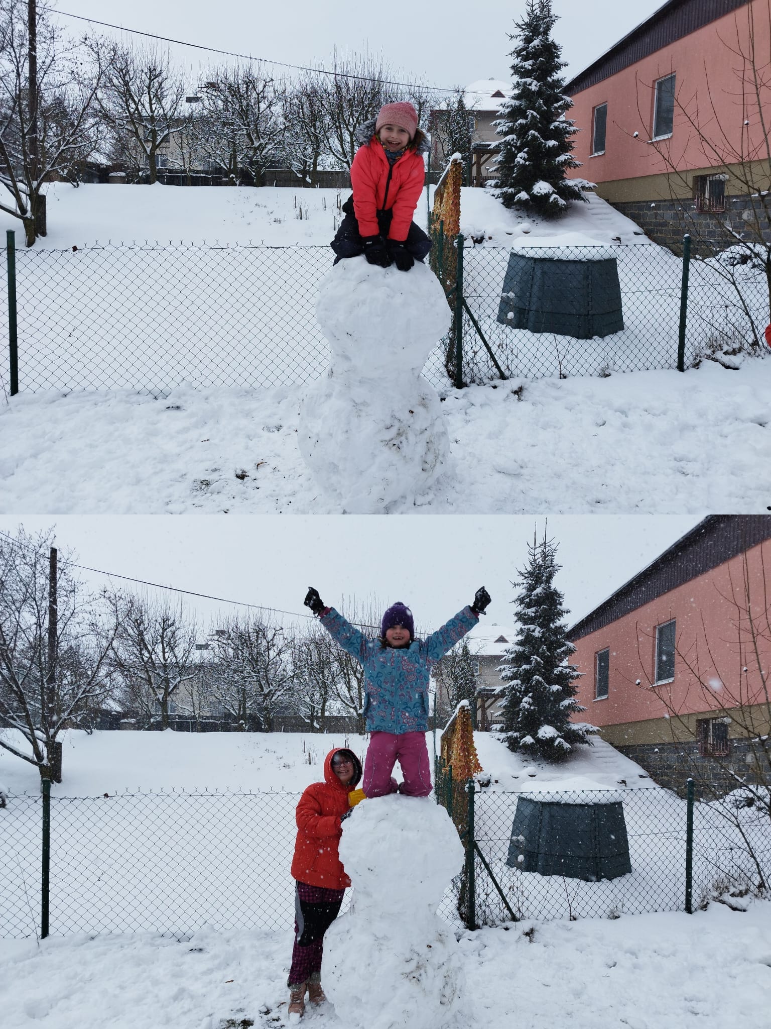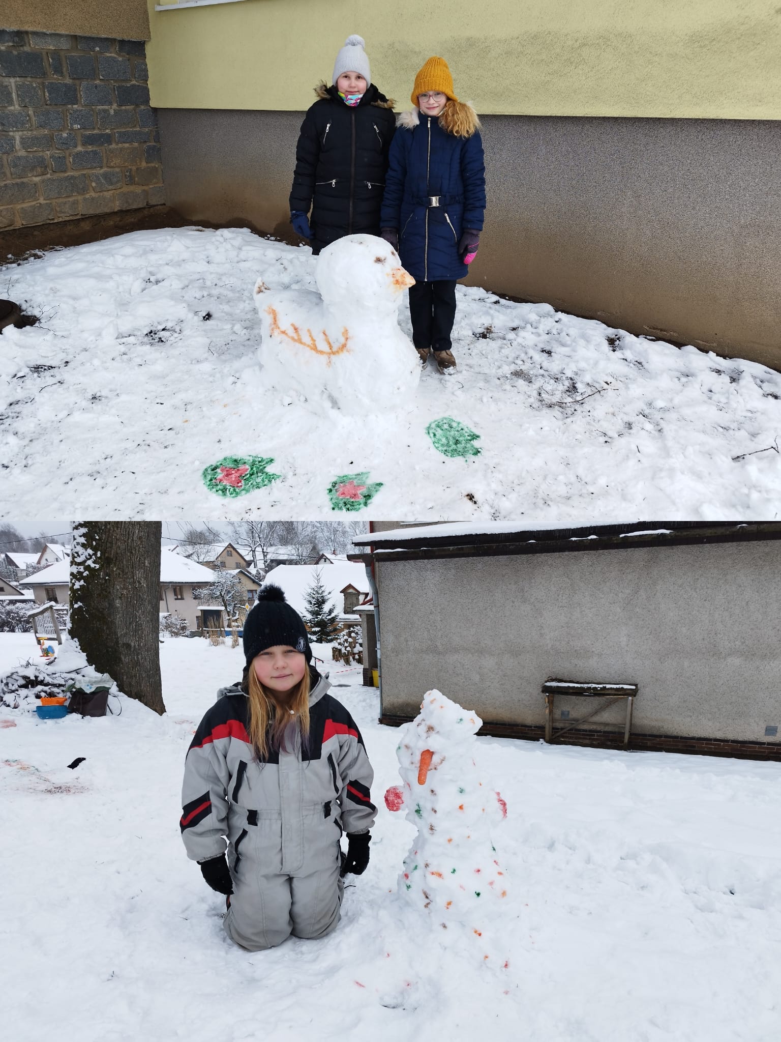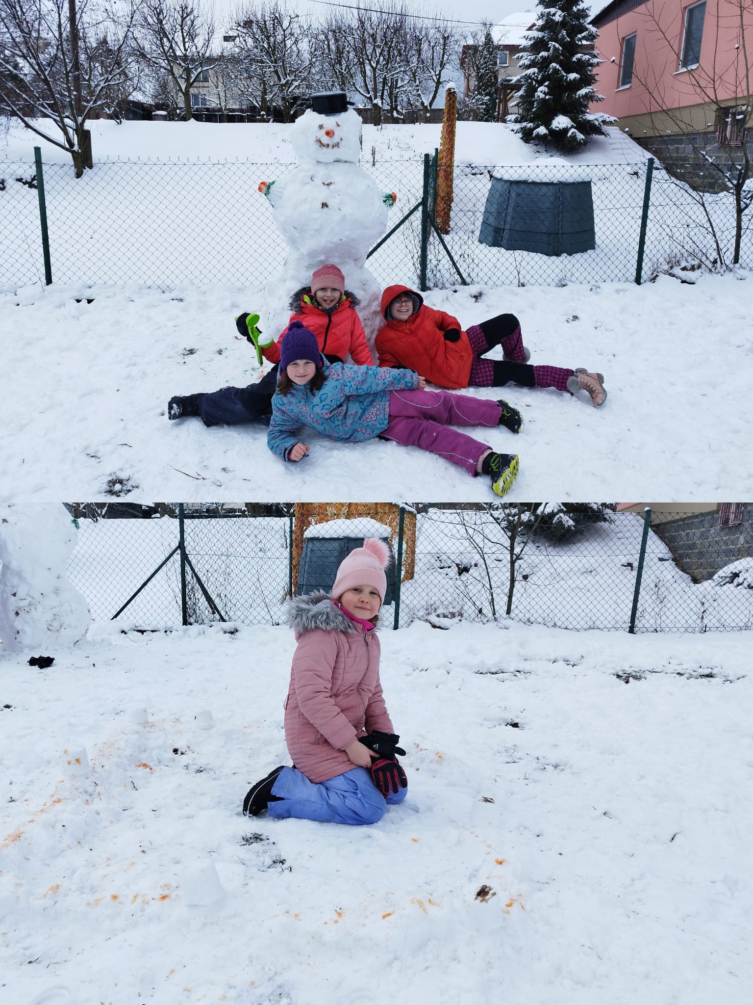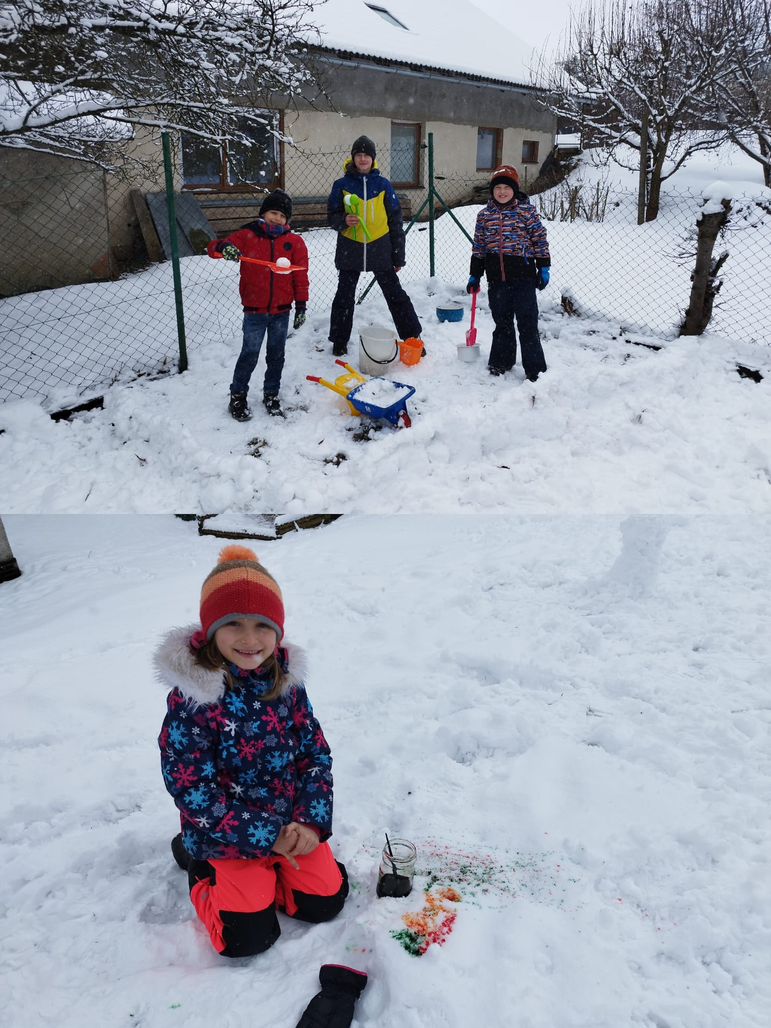 Využili jsme i sněhové nadílky a vydali se na školní zahradu. Děti společně stavěly sněhové stavby a postavy – vznikl bunkr ze sněhových koulí, obří sněhulák a další nápadité výtvory. Nechyběla ani abstraktní malba do sněhu. Vykouzlily krásná díla a hlavně si děti při tvoření užily spoustu legrace.